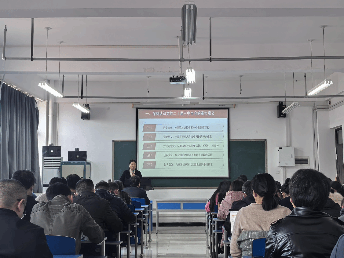 侯艳芳老师以“深刻认识党的二十届三中全会的重大意义”、“全面理解党的二十届三中全会的主题和措施”、“坚决贯彻落实好党的二十届三中全会精神”等内容,总体上把握党的二十届三中全会精神,从九个方面对党的二十届三中全会精神进行了深入解读。整场宣讲会引经据典、深入浅出,既有理论高度,又紧密联系学校和学院实际,具有很强的指导性、针对性和实效性,加深了全体教职工对全会精神的理解和把握。
