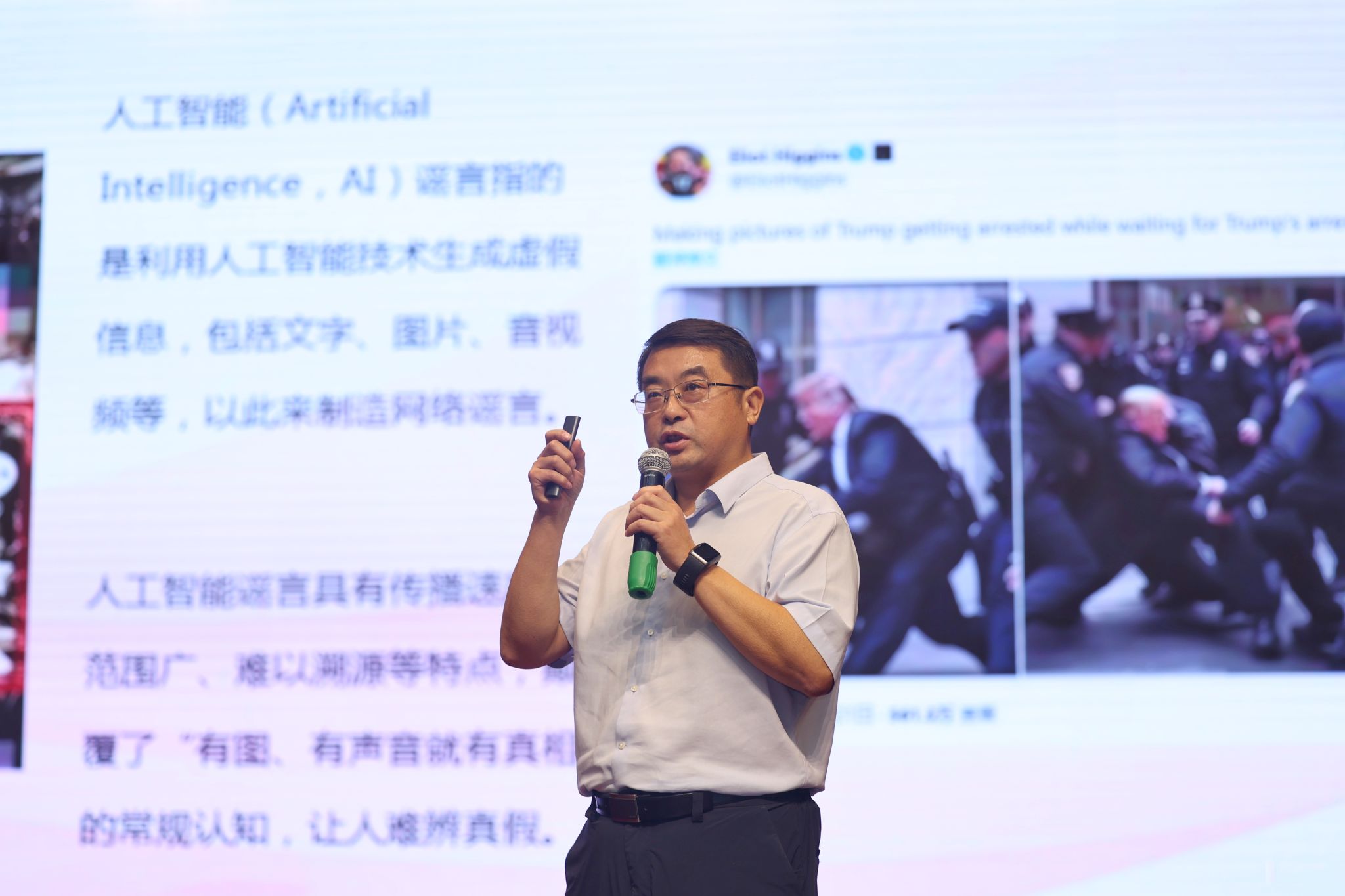 副院长杨关,通过讲述人工智能谣言的具体案例,概括出了人工智能谣言的具体类型,直指谣言的危害。在谈到信息化时代如何鉴别谣言,杨关指出首先要鉴别信息来源,并借助技术手段观察图片、视频的细节。其次,媒体机构要提高自律意识,客观公正的报道。最后,政府监管部门加强监管力度,建立健全法规制度。